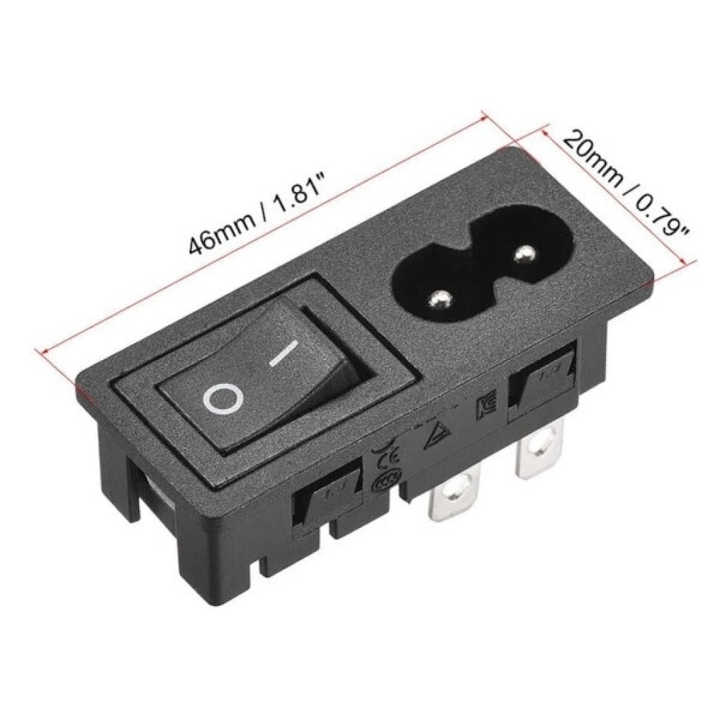 IEC C8 2-Pin Anahtarlı Power Soketi, 250V 2,5A 2-pinli anahtarlı power soketidir. Elektronik cihazlarda, ev aletlerinin kontrolünde yaygın olarak kullanılır.